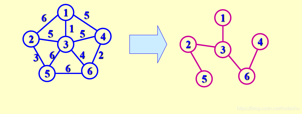 最小生成树: 在一个连通网的所有生成树中,各边的代价之和最小的那棵生成树称为该连通网的最小代价生成树 (Minimum Cost Spanning Tree), 简称为最小生成树。