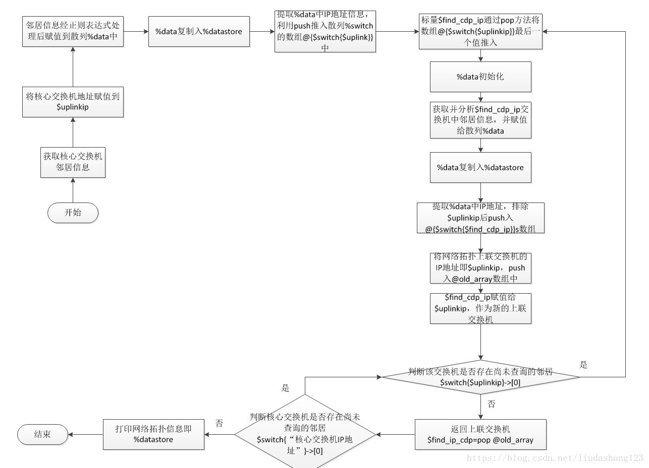 (1)最开始的方法,先声明三个hash——dataHash,readHash,cmpHash,dataHash存入有cdp信息加工得到的交换机名与IP地址对,先将dataHash信息存入readHash,然后遍历readHash的IP,读取每台交换机的cdp信息形成hash并赋值给dataHash。一轮遍历完毕后,将readHash赋值给cmpHash。然后比较cmpHash和dataHash,选取cmpHash没有的键值对,然后赋值给readHash再重复上述步骤,直到遍历完整个网络拓扑。
