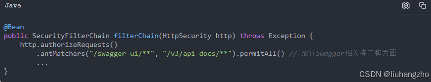 为了使 Swagger UI 可以被未认证用户访问,在配置类中的 SecurityFilterChain 方法内需允许特定路径免受安全拦截: