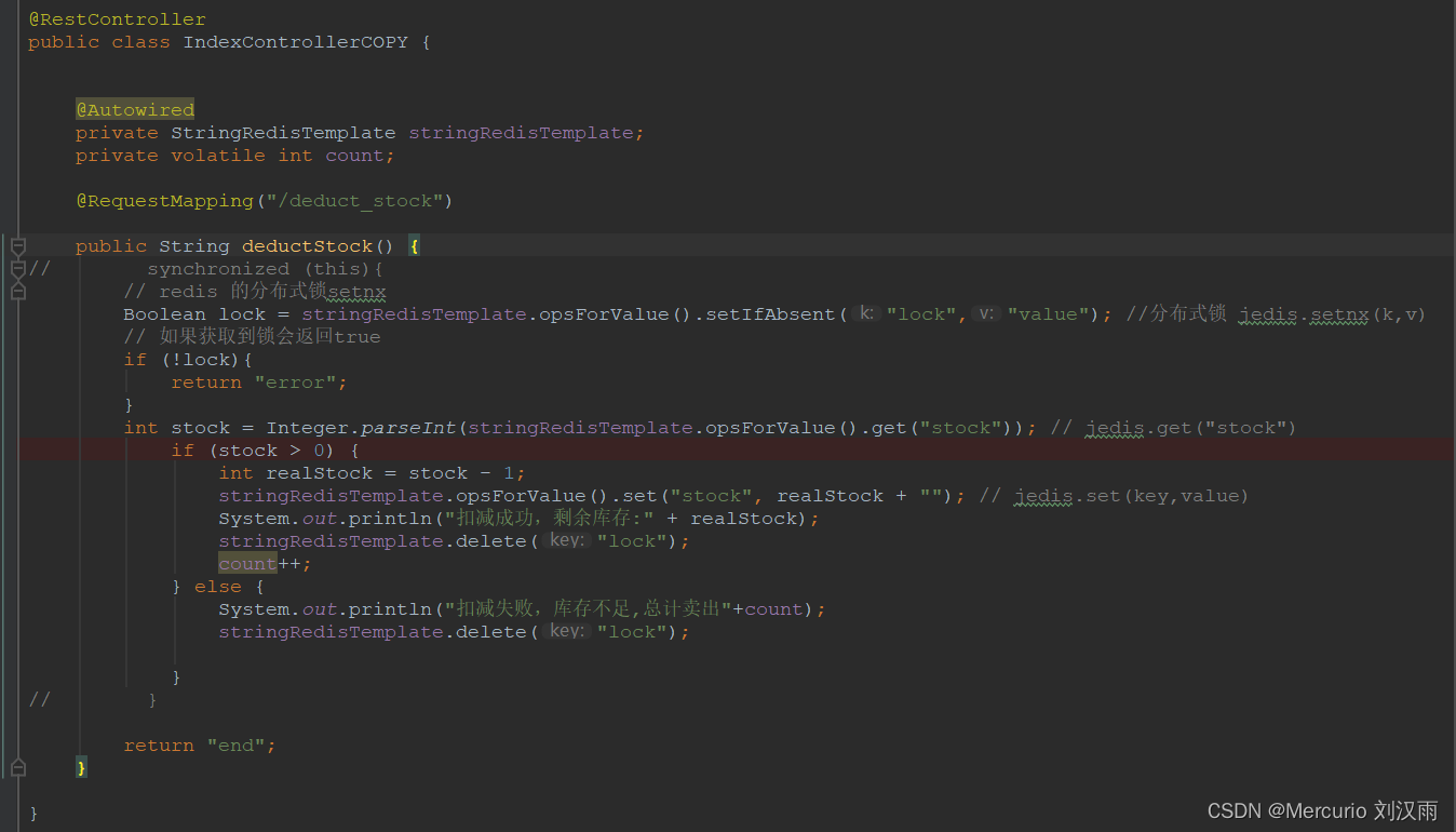 int stock = Integer.parseInt(stringRedisTemplate.opsForValue().get("stock")); // jedis.get("stock")
