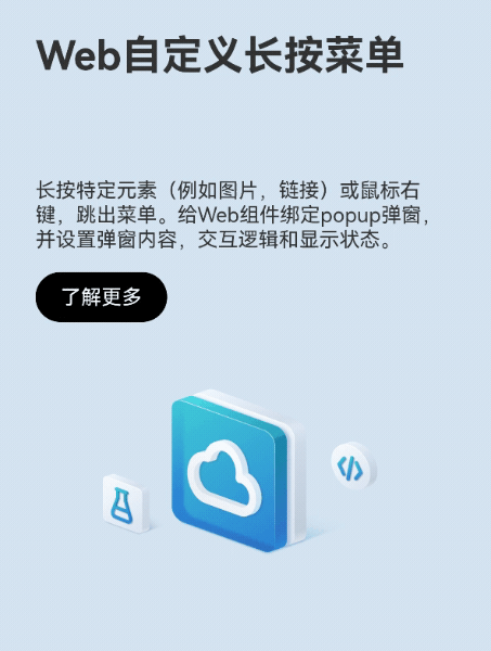 长按Web页面中的图片或者链接元素,弹出自定义的Menu菜单,创建自定义的操作,如复制图片、使用浏览器打开链接、复制链接等。