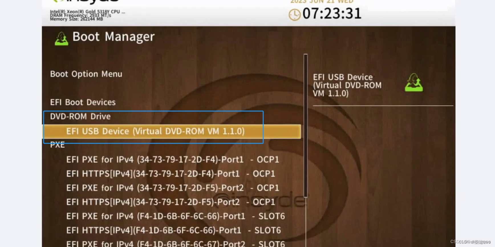 4、在Boot Manager中选择DVD-ROM并回车,即可进入ESXI系统安装界面