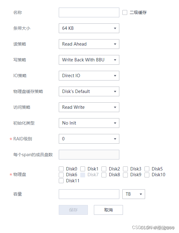 2、选中待操作的RAID控制器。单击“添加”,打开创建逻辑盘区域,选择阵列级别及物理磁盘(其他选项可默认),之后保存即可!
