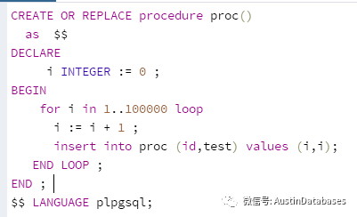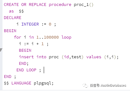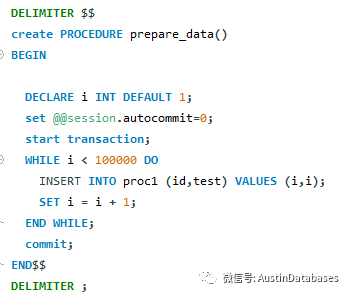 下面就来一个例子开刀, 下面是两个存储过程,往一个表里面插入10万条数据,同样的数据最后不一样的耗时。一个要将近1分钟,另一个 5秒钟,同样的功能,同样的结果。