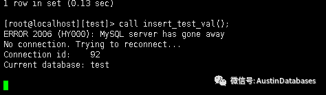 字段瞬间添加上了,但是存储过程在运行的途中直接报错,通过上表的实验证明 MYSQL 8 添加字段,不在是一个问题,PT 工具可以收手了。