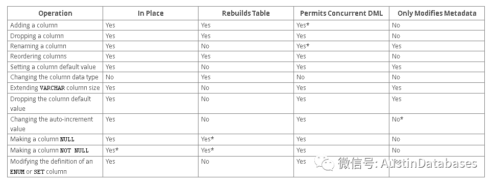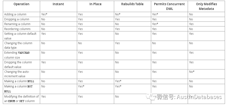 但实际上可以看出这个立即能做的事情不多,adding a column ,setting a column default value , Dropping the column default value 这些才可以进行instant 但 最常用到的 adding a column也上面有一个* 号,这说明不可以都可以,是要有条件的。