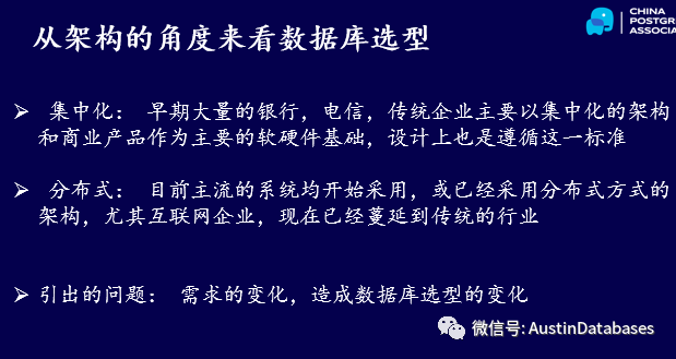 下面从架构的角度来看数据库的选型,早期大量的银行,电信,传统企业里面大部分都是购买的商业的系统,或整体的商业解决方案,比如小型机+BD2,或者ORACLE 的数据库,从成本的角度来,刚才已经讲过了,如果开源数据库能满足需求,并降低成本何乐而不为。