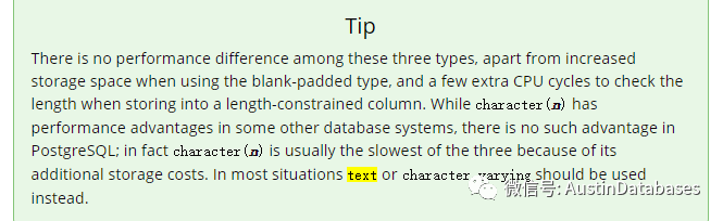 PostgreSQL 在这方面和其他的开源数据库不太一样,甚至和商业数据库也不大一样,他的宽容度和包容度都比较大,在设计和开发软件的时候,不需要那么用力,我们以 postgresql 11 作为我们的例子,这是PG11版本中tip,由于原理的原因,在PG 中text 和 varchar之间是没有什么性能的差别的。(当然如果你往一个字段里面放置几十MB ,上百MB的情况,另当别论),所以在字段大小设计方面的问题的矛盾点就被化解了。