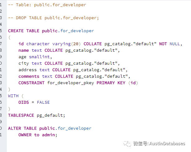 其实也是听到一个声音,就是PG在某些方面不如别的数据库在语句的写法上宽泛,实际上第一张图是手写的,如果不和你说明估计也不大能分的很清楚与某些其他数据库建表语句的明显区别,PG对语句的兼容性并不低,下图是从PG_ADMIN导出的语句,最终实际的PG标准的语句是这样的,这也明显的看出, PG的包容性。