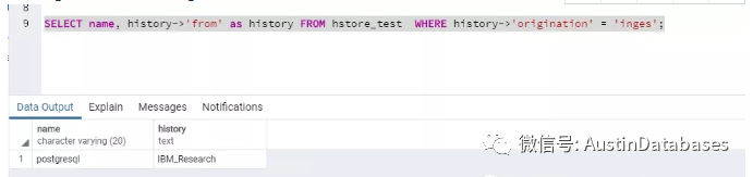 SELECT name, history->'from' as history FROM hstore_test WHERE history->'origination' = 'inges';