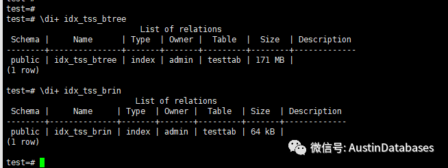在创建表和索引后,我们对比同样的功能,两个索引的大小相比,BTREE 是171MB 而 BRIN 索引只有 64kb.