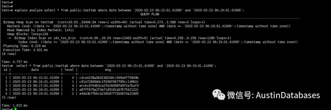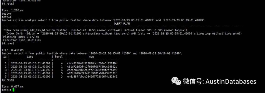 explain analyze select * from public.testtab where date between '2020-03-23 06:15:01.41099' and '2020-03-23 06:19:01.41099';