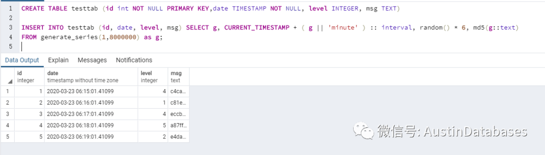 INSERT INTO testtab (id, date, level, msg) SELECT g, CURRENT_TIMESTAMP + ( g || 'minute' ) :: interval, random() * 6, md5(g::text)