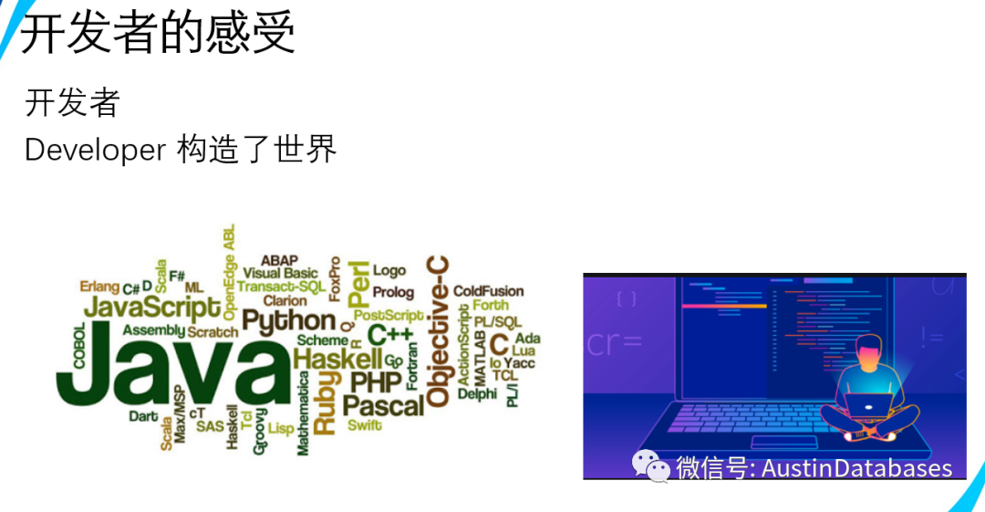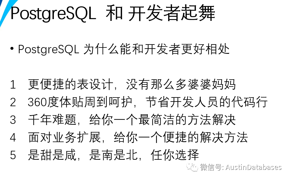 实际上很多数据库的对比的活动都是基于数据库本身的一些的底层的功能以及纯数据库方面的对比,等等。更多方面数据库是要为应用来服务的,而生产应用的大部分都是与程序员有关的,怎么服务于程序员,提高程序员的舒适感,也是一个重要的话题,提高了程序员的工作效率,减少代码量,将逻辑下移,减少程序中的BUG,这是一个数据库可以做到的,不是每个企业都是互联网企业,不是每个业务都是高并发的业务,我们有大量复杂业务,如果将业务逻辑全部都在程序端实现,势必会增加程序员的劳动力,开发周期延长,后续的程序的灵活性也会受到部分限制。