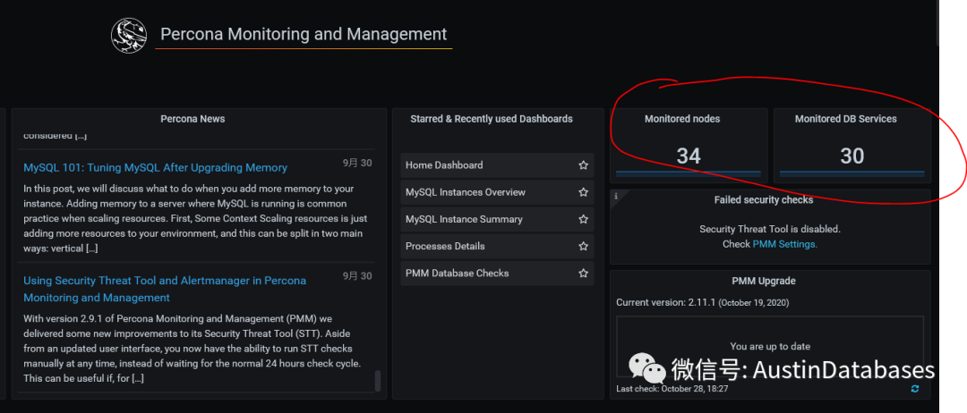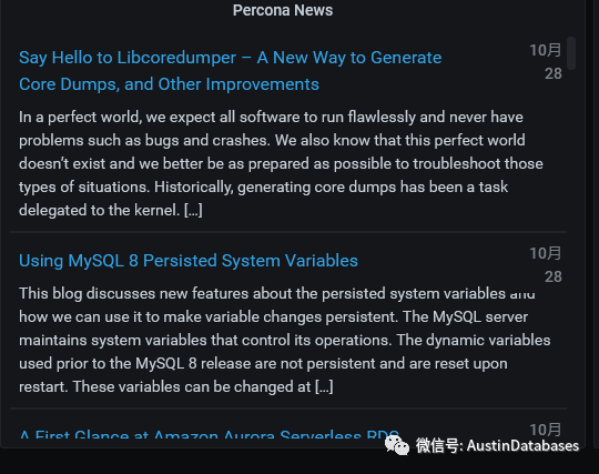 本篇仅仅是介绍一些PMM2上简单的监控使用方式,后面会随着深入,介绍更多PMM监控系统的一些有意思的地方。这里面有意思的 PERCONA 的PMM 系统在打开系统后,会有一些PERCONA 的NEWS ,也可以通过此信息学习一些新的知识,当然E文的READING 要GOOD。
