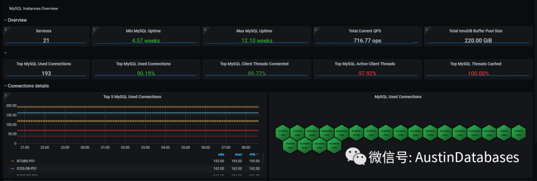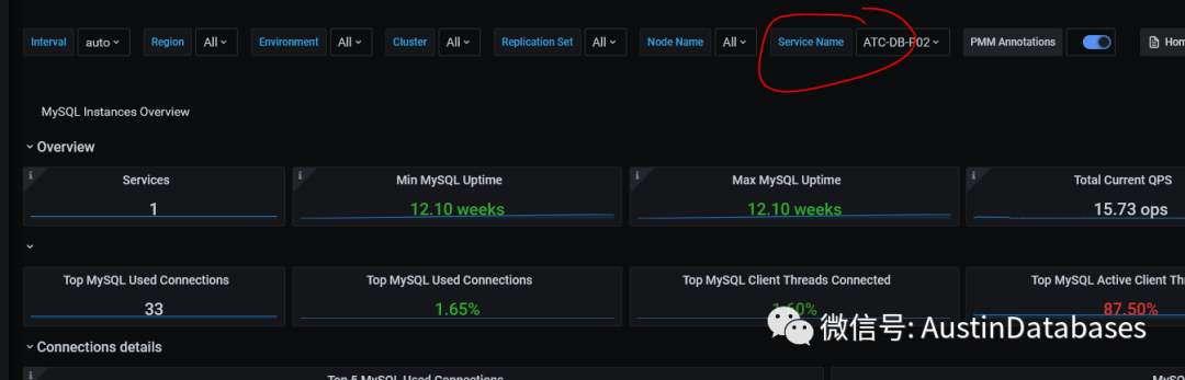 当然如果对那个数据库服务器想具体看,则使用service name, 选择你需要关注的服务器。下面就会显示你关注的服务器的 QPS 连接数