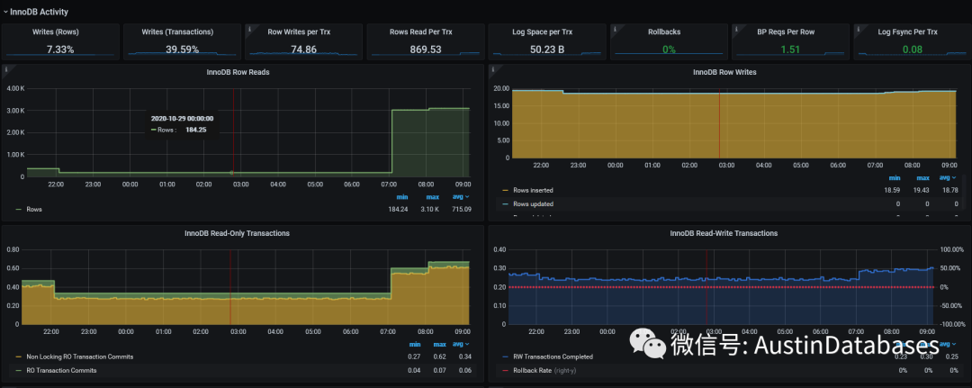 其中在MYSQL INSTANCES OVERVIEW 中可以查看到connections , TPS ,DATABASE I/O ,data fsyncs, Sorts details , locks ,network等等信息,