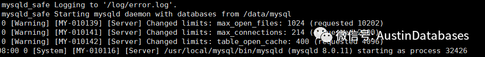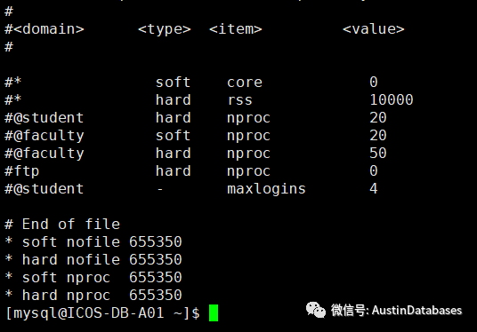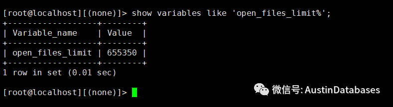 同时可以进入MYSQL 数据库中,查看open_files_limit 这个值应与 limits.conf 文件中的值一致.