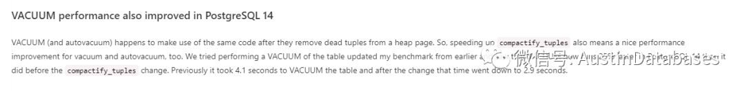 数据库vacuum 的速度在POSTGRESQL 14中也是提高的,下面这段文字描述了在测试中提高的速度对同样的数据进行vacuum的速度从 4.1秒提高了2.9秒.