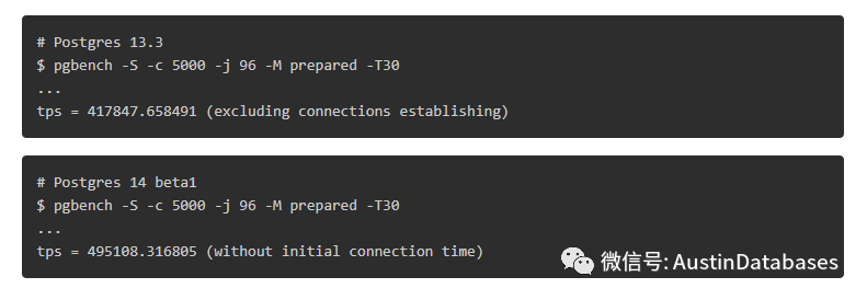 这里有一个测试关于PG13.3 和 PG14 之间的连接时TPS 的不同, 这里5000个连接时,14 强于 13 20% ,1000个连接强于 50%的 TPS .