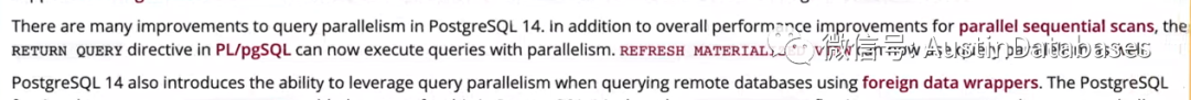 另外的一个更新就是POSTGRESQL 14中对于并行查询的性能提升,同时支持TOAST使用新型的压缩方式,减少CPU的占用提高压缩的比率LZ4的方式.