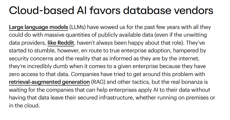 云原生 AI 更青睐数据库厂商 过去几年,大语言模型(LLM)通过处理海量公开数据展示了惊人的能力(尽管像 Reddit 这样的数据提供者对此并不总是情愿)。但这些模型在真正进入企业场景时却频频受挫,面临安全、合规等现实问题——它们对互联网了解得再多,也对某家企业的内部数据一无所知。企业尝试通过 RAG(检索增强生成)等技术绕开这些问题,但真正的机会在于:谁能让企业在自己的基础设施上,安全地将 AI 应用于自己的数据,谁就能赢得这场 AI 金矿战。