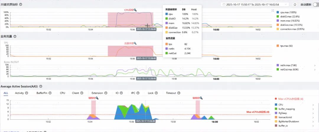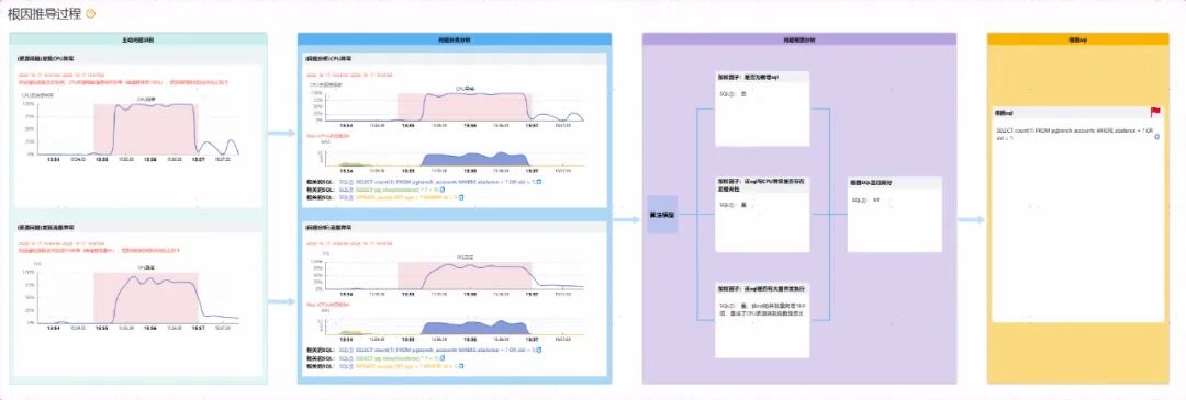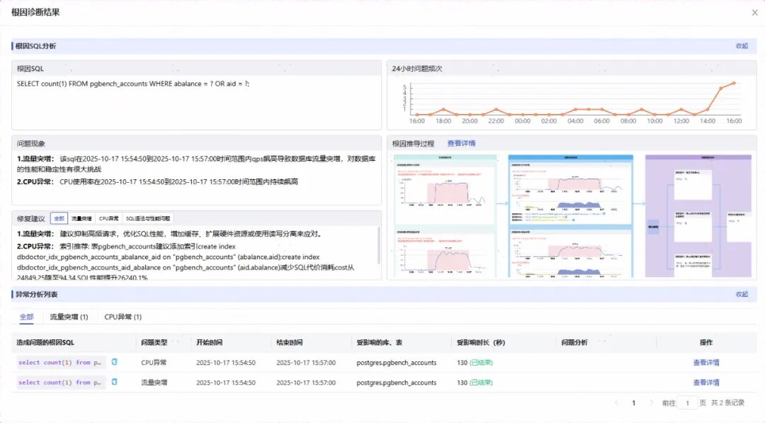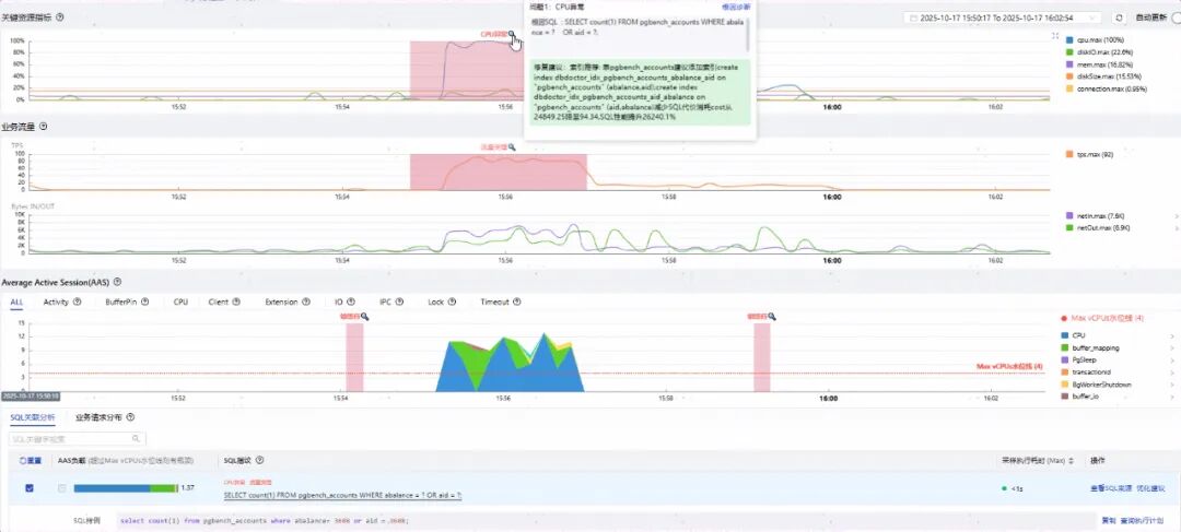 我:人家不告诉你了一分钟解决问题,看CPU异常,把鼠标放到异常上,下面就会出现在这期间运行的SQL。你勾选这个SQL然后直接点击SQL,就出现下面的的根因分析了。