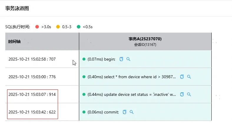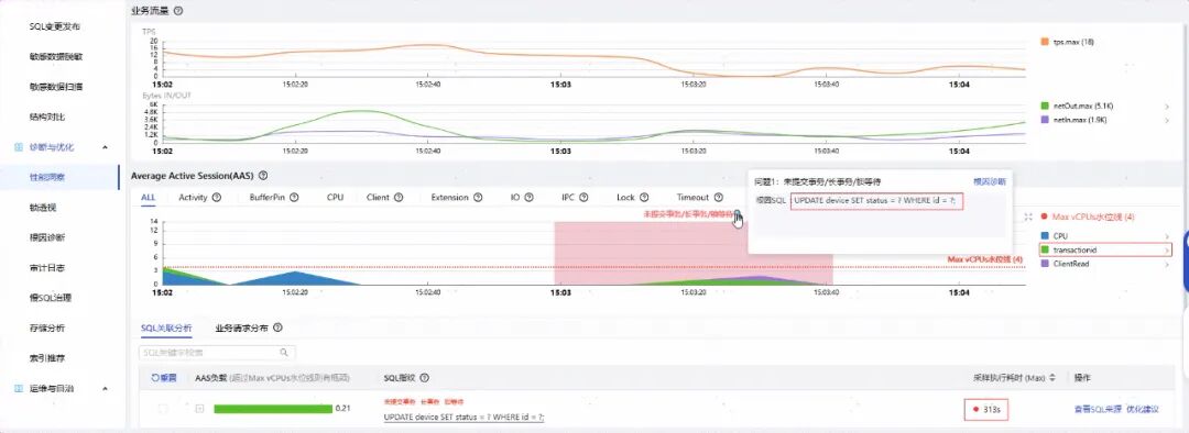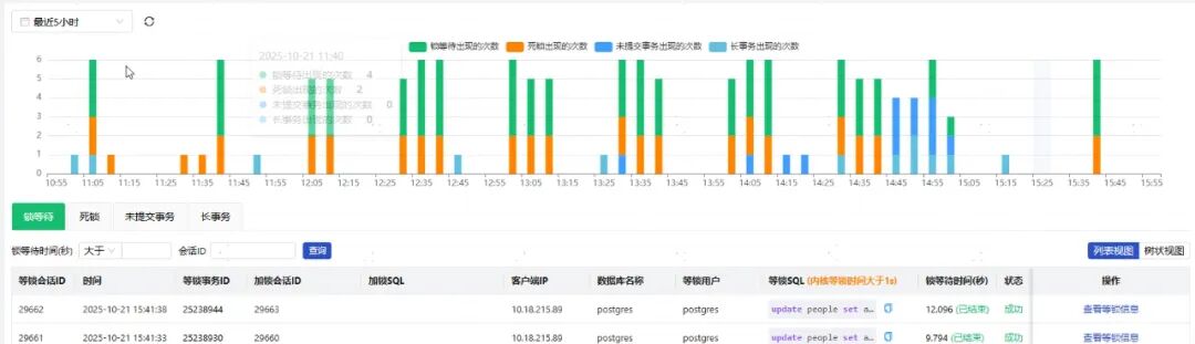 不一会,系统就开始显示数据,问题清晰的展示在屏幕上,一条应该执行很快的SQL执行了300多秒,但问题很快就定位出来了,发生了锁等待,这条SQL被阻塞了。