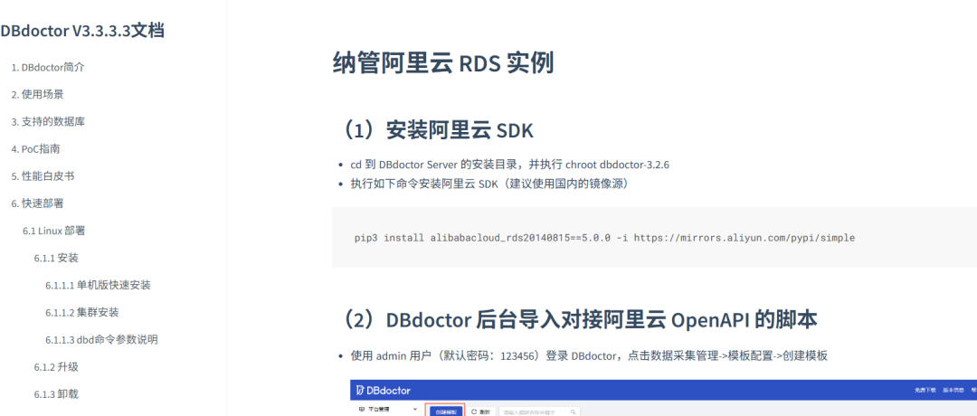 DBdoctor 辛老师: 可以的,我们这边有文档,我们可以直接接入到云上的数据库产品,您看这里我们直接接入到阿里云内部,直接获取他们的后台数据库,这样您公司的复杂的线上,线下,还有国产数据库就都可以通过一个数据库运维软件管理起来了。