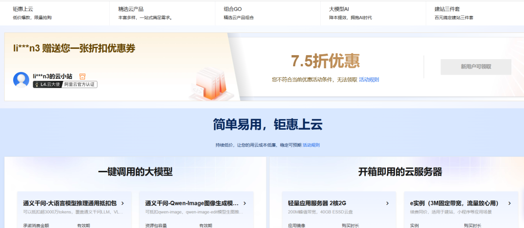 自从去了阿里云总部后,了解一些产品后,阿里云的一些产品,针对有一些人是可以有优惠的。很荣幸,今天我有这个能力了,针对当前AI热门的计算和使用,很多人还在门外,其实我也想用用,也就申请了一下,提高自己能力。同时也申请了特殊的福利。从下面链接了解产品的,一律 7.5折扣。(点击阅读原文也可)