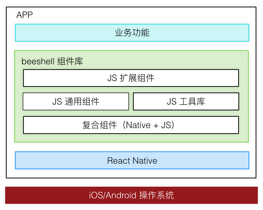 beeshell 组件库基于 React Native,向下通过 React Native 与 iOS、Android 平台进行系统层面的交互,向上提供开发者友好的统一接口,抹平平台差异,为用户开发业务功能提供服务支持。beeshell 扮演了一个中间者的角色,从而保证了移动端应用基础功能的稳定性、易用性。