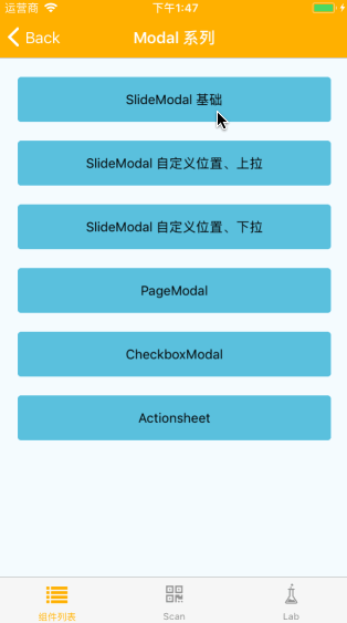 继承 Modal 组件,对动画、弹出容器做了重写,在初始化时实例化 SlideAnimated 类型对象,完成上拉、下拉动画,同时支持了自定义弹出位置的功能。