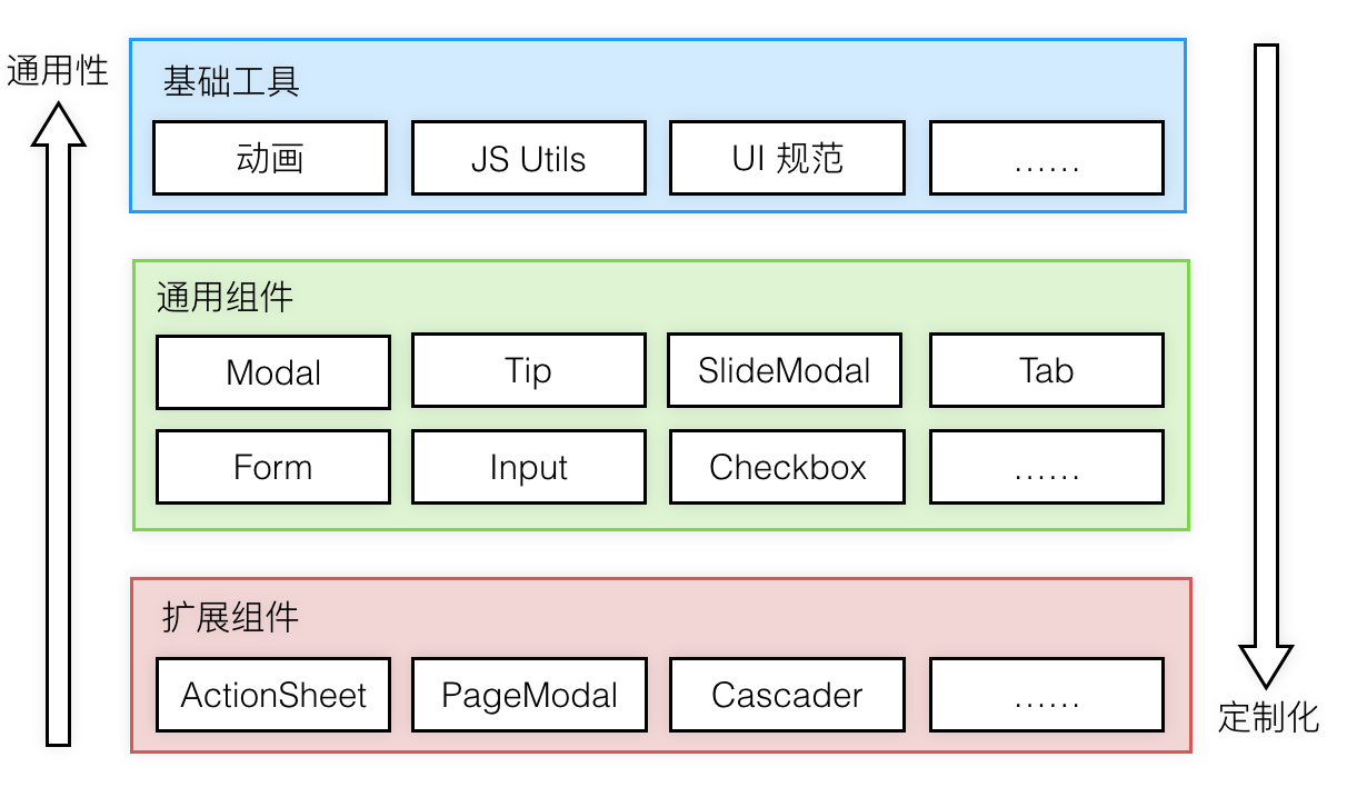 JS 组件部分使用了层次化的体系结构风格,整体分成三层:基础工具、通用组件、扩展组件,从上到下通用性逐渐减弱、定制化逐渐增强,功能渐进式增强,通过分层设计,各层各司其职,兼顾通用性和定制化。
