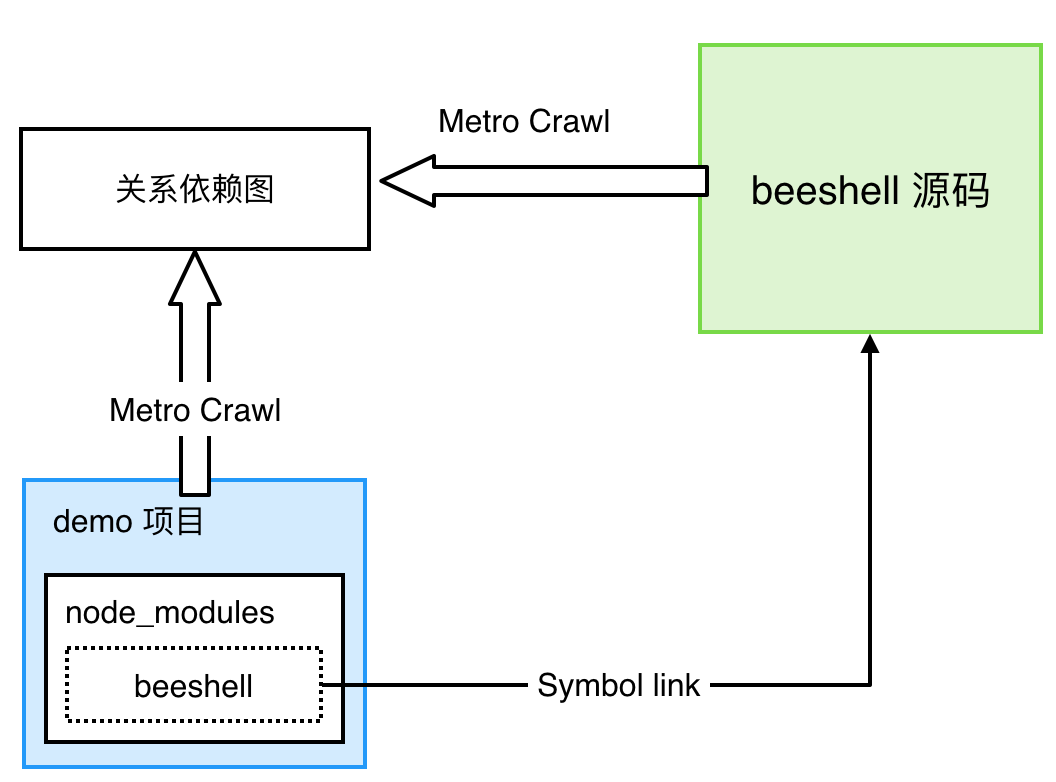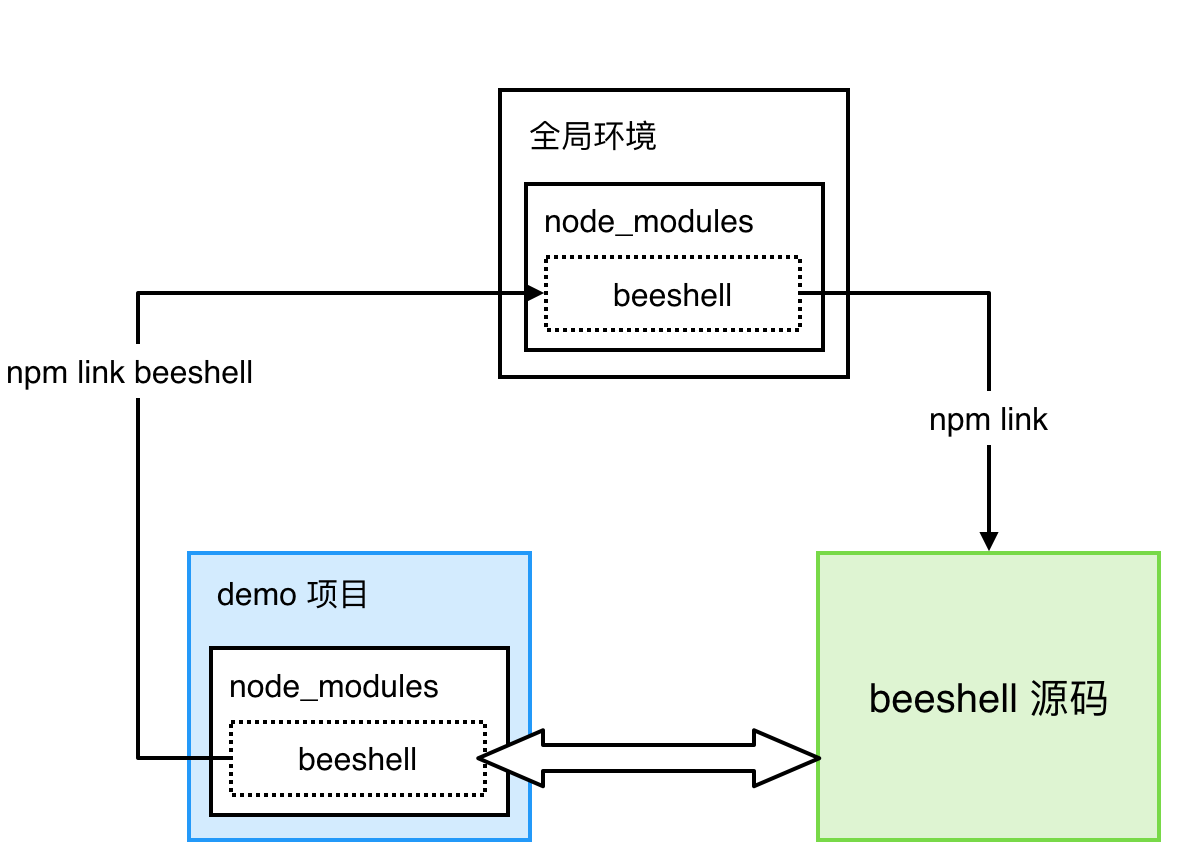 通过 ln -s 命令,直接建立 demo 项目 node_modules 下 beeshell 包 与 beeshell 源码的软链接: