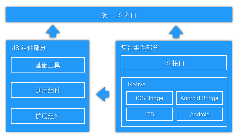 复合组件部分可以直接暴露 JS 接口,如果有需要,也可以在 JS 组件部分进行定制化封装。我们尽量保证 Native 部分功能的原子性、简洁性,有任何定制化需求都使用 JS 来统一实现,遵循 JS 实现优先的设计原则,保证跨平台通用的特性。下面分别介绍 JS 组件部分和复合组件部分的设计。