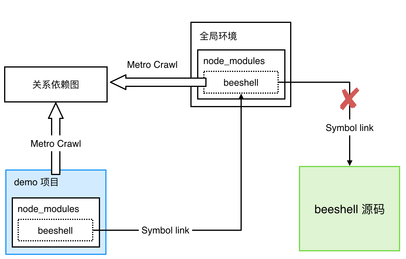 分析发现 Metro 的特定路径默认是运行打包命里的路径,以及 node_modules 下第一层目录,这样我们就定位到了问题的所在: