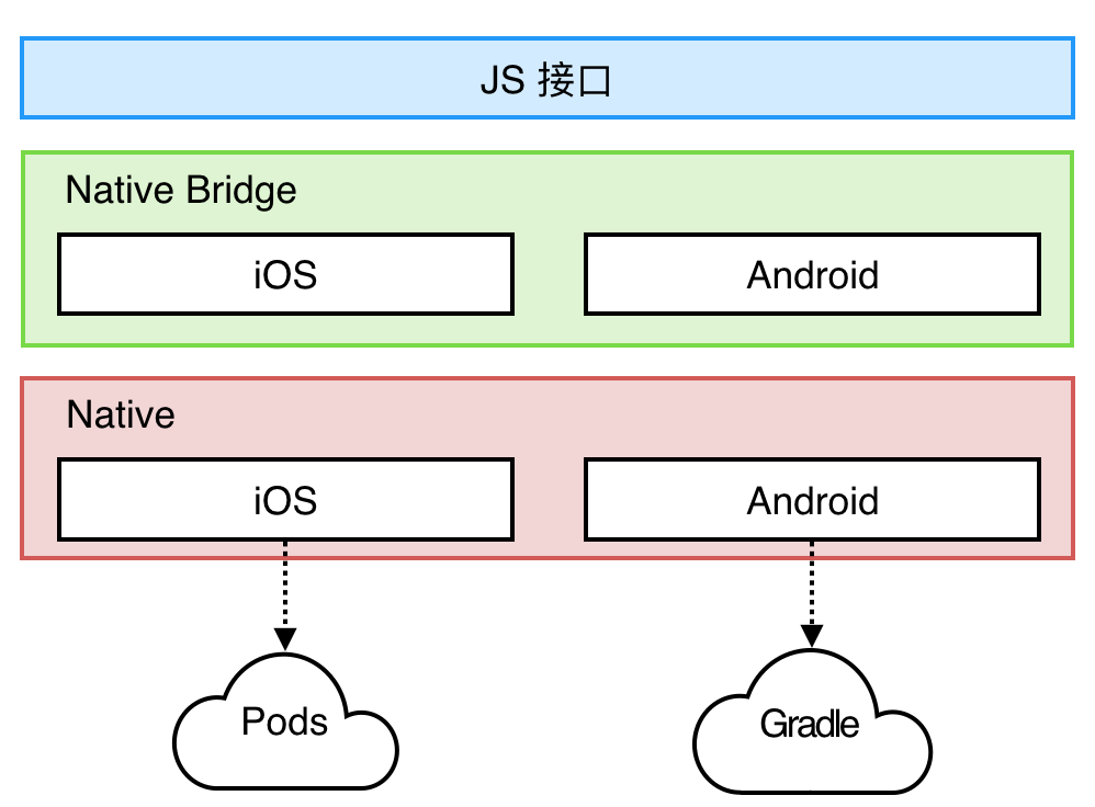 复合组件部分通过 JS 封装接口,保证了跨平台。Native 部分主要分成 Native Bridge 和纯 Native 两大部分,Bridge 是针对 React Native 的封装,必须在组件库中实现;而纯 Native 部分则可以通过 Pods/Gradle 依赖三方实现,有效的吸收利用原生开发的技术积累。