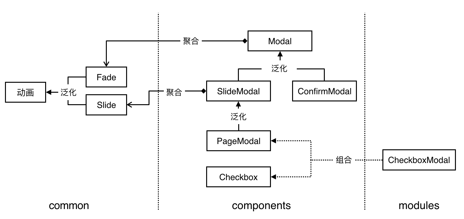 动画部分在基础工具(common)中实现;在通用组件(components)中 Modal 组件聚合 FadeAnimated 动画,同时因为 SlideModal、ConfirmModal 比较通用,也在该部分实现;CheckboxModal 则定制化比较强,归类到扩展组件(modules)中。通过这种方式的分层,三层各司其职,使得组件库的层次结构更加清晰,不仅实现了定制化,还保证了通用部分的简洁性和可维护性。