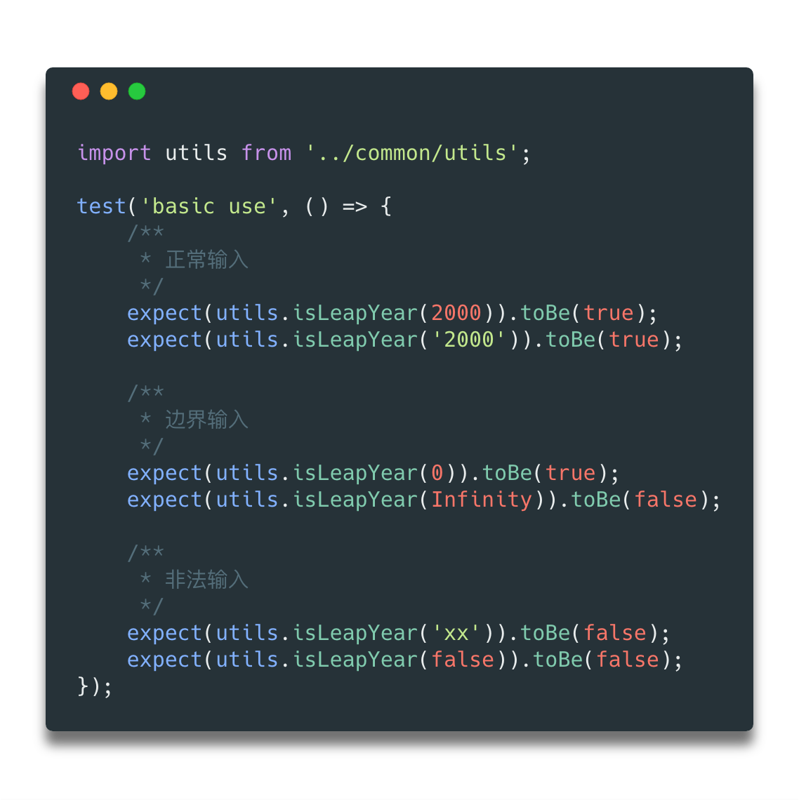 测试用例的核心是输入数据,我们会选择具有代表性的数据作为输入数据,主要有三种:正常输入,边界输入,非法输入,下面以组件库中提供的 isLeapYear 工具函数来举例说明,代码如下: