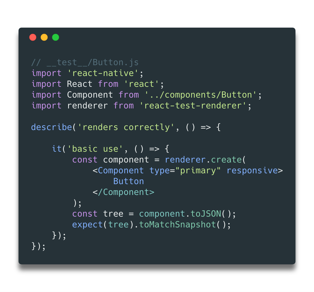 想要确保组件库的 UI 不会意外被更改,快照测试(Snapshot Testing)是非常有用的工具。一个典型的移动 App 快照测试案例过程是,先渲染 UI 组件,然后截图,最后和独立于测试存储的参考图像进行比较。使用 Jest 进行在快照测试,在 beeshell 中第一次对某个组件进行测试时,会在测试目录下创建一个 snapshots 文件夹,并将快照结果存放在该文件夹中。快照结果文件以 <组件名>.js.snap 命名,其内容为某个状态下的 UI 组件树。
