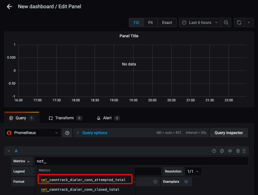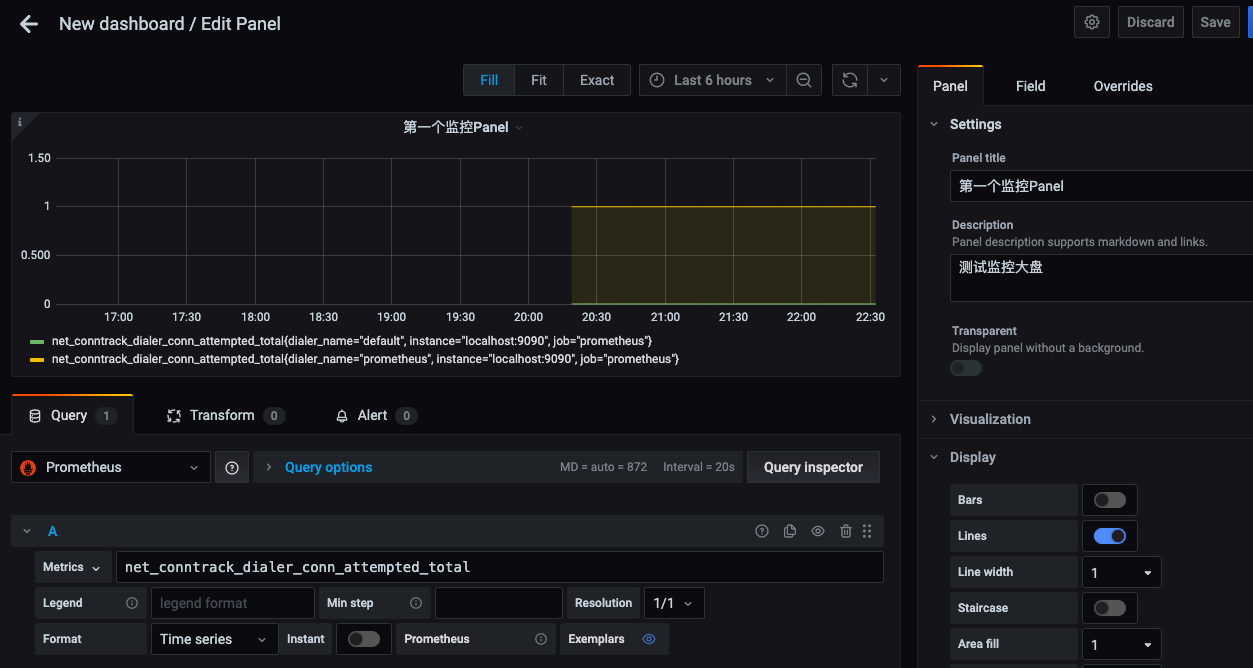 前面提到,prometheus有默认对主机的监控,所以可以看到,在上面编辑query条件时,输入net_后下拉框自动弹出了目前已经进行了采集的指标列表,选择第一个之后就能够看到监控图表中动态展示的数据内容: