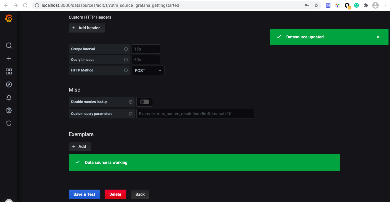 在HTTP=>URL这一栏,填写http://localhost:9090,点击底部的Save & Test,即可保存成功: