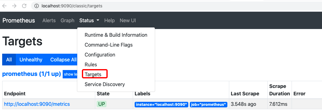从而可知,prometheus的默认启动端口为9090,启动后,在浏览器中通过http://localhost:9090 即可查看服务。