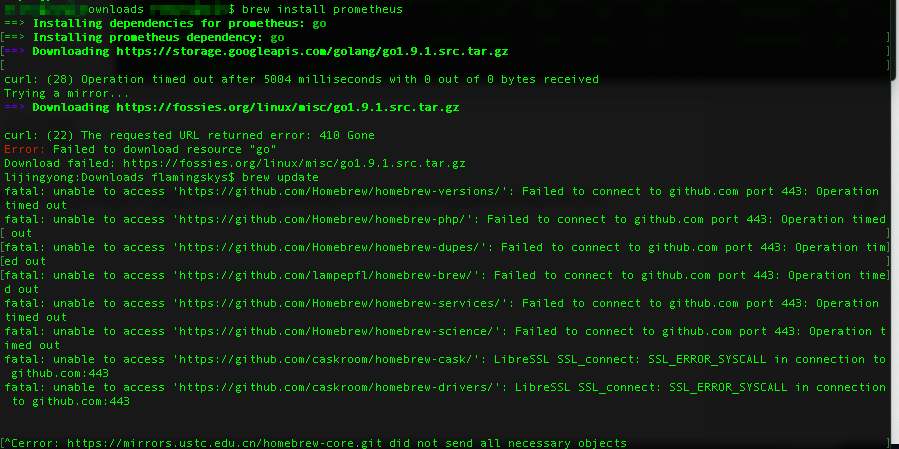 尝试安装监控工具prometheus的时候,由于换了自己的旧电脑,发现brew install失败,报错信息如下: