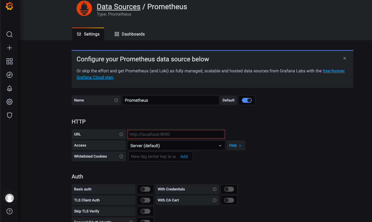 上面的首页截图中,可以看到有DATA SOURCES配置,我们点击这里,添加prometheus作为数据源:
