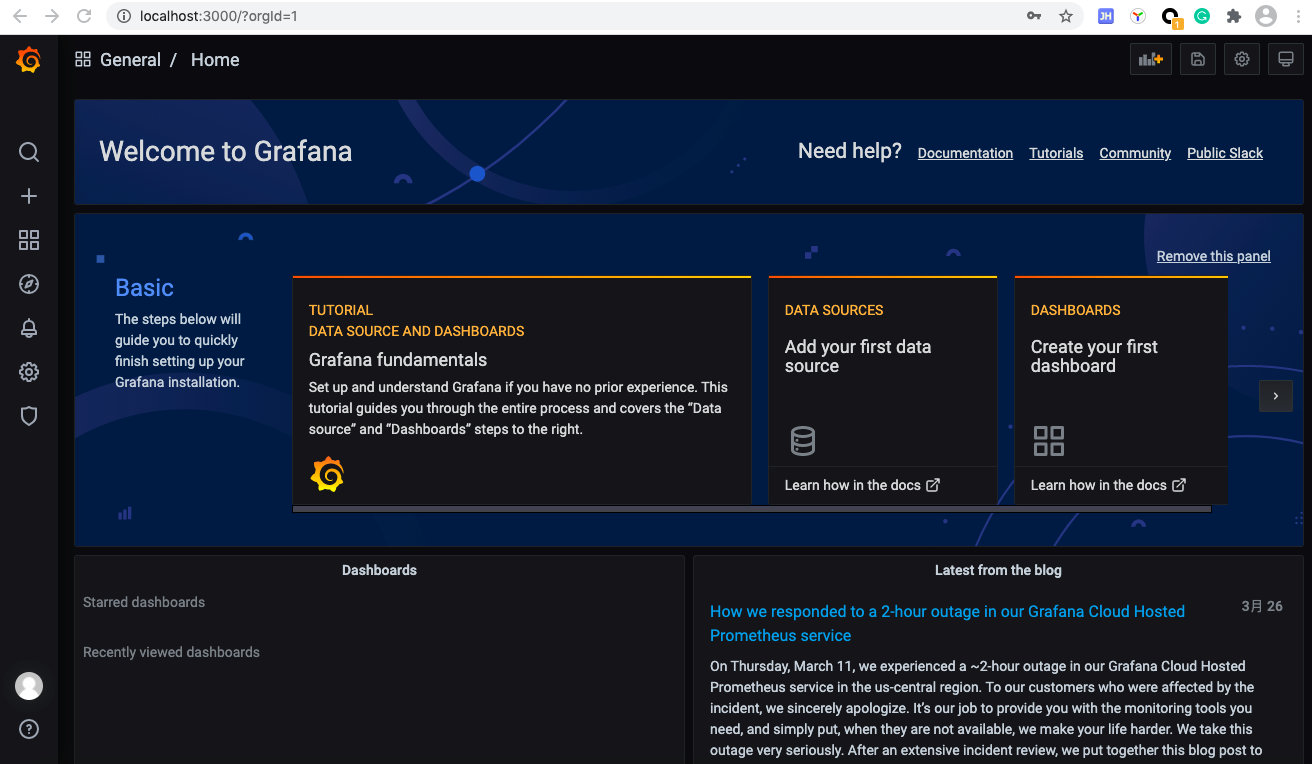 grafana默认的用户名和密码都是admin,可以输入执行登录。如果顺利的话,可以进入首页如下图所示:
