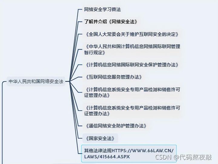 了解并介绍《网络安全法》 《全国人大常委会关于维护互联网安全的决定》 《中华人民共和国计算机信息系统安全保护条例(2011年修正)》 《中华人民共和国计算机信息网络国际联网管理暂行规定》 《计算机信息网络国际联网安全保护管理办法》 《互联网信息服务管理办法》 《计算机信息系统安全专用产品检测和销售许可证管理办法》 《通信网络安全防护管理办法》 《国家安全法》 其他法律法规HTTPS://WWW.66LAW.CN/LAWS/415664.ASPX