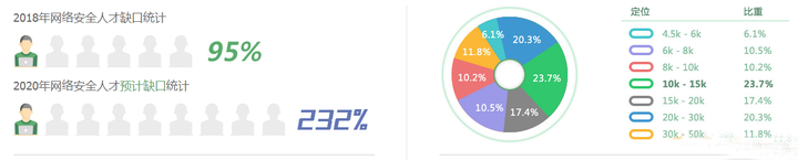2018年我国网络安全人才缺口超70万,国内3000所高校仅120所开设相关专业,年培养1万-2万人,加上10-20家社会机构,全国每年相关人才输送量约为3万,距离70万缺口差距达95%,此外,2020年网络安全人才需求量直线增长,预计达140万,人才需求将飙升232%...