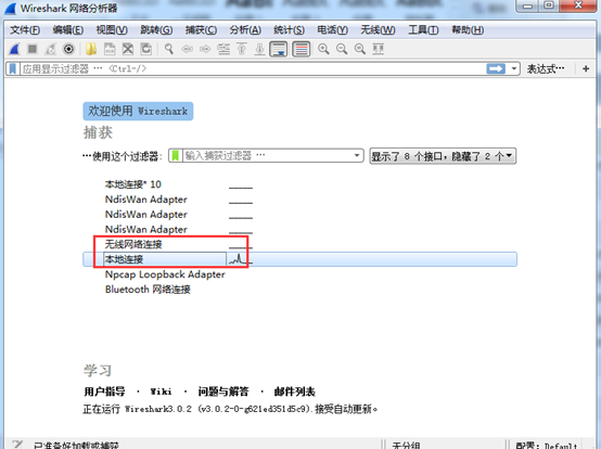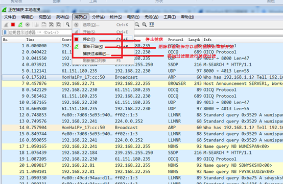 1.1 选择本地连接进入-点击捕获查看各项功能,默认为开始捕获状态
