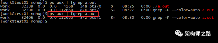 ps再次确认,可以看到关闭session之后,进程号是32389的a.out进程也关闭了。